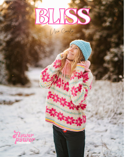 Jeg har denne gangen blitt inspirert av blomster, og deres evne til å komme tilbake år etter år. Til å gro, vokse, spre bladene sine og virkelig skinne! Det holdt ikke bare å lage ett plagg i denne stilen, og jeg har derfor laget en hel Flower-Power kolleksjon som inneholder flere gensere i ulik fasong, design og monteringsteknikker. Bliss er den første genseren som slippes, og har en oversized passform med isydde ermer og strikkes i deilig norsk lamull fra Hillesvåg eller Rauma. Jeg håper du fargelegger den akkurat slik du ønsker. I oppskriften finner du inspirasjon til ulike fargesammensettinger.